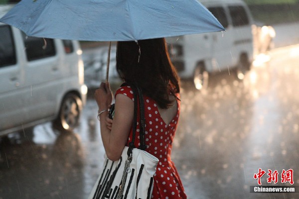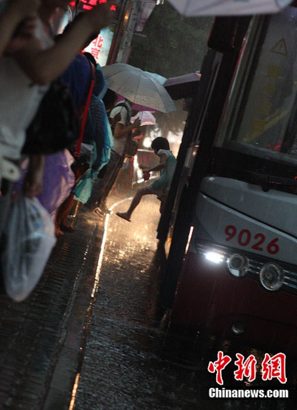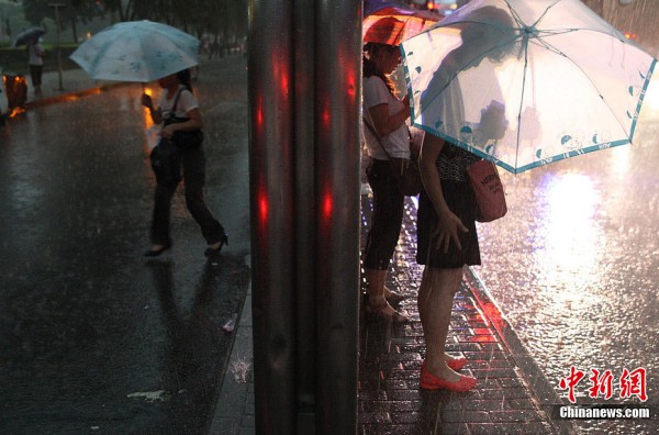 北京7月24日傍晚迎来大到暴雨,强降雨再次考验北京的道路、排涝等公共设施。北京市气象台14时左右分别发布了雷电黄色、暴雨蓝色预警信号。图为雨中等车的市民。