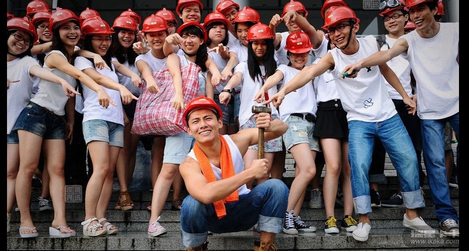 2012年5月3日,广州,广东外语外贸大学新闻与传播学院广告081班举行“社会主义新民工”主题毕业照活动。据该班班长阿文介绍,这副农民工打扮,平均每人才11元多,真的连“民工”都消费得起。而他们手上的扳手、冲击钻等专业工具,则是特意问学校的机电房工人借来的。“这个主题毕业照已筹备一个多月。”阿文说,“社会竞争越来越激烈,大学毕业生已经不再是天之骄子,大学毕业生的薪水和农民工也差不多。因此大学毕业生更要转变心态,适应社会,不要计较职业的贵贱,脚踏实地从基层做起,哪怕等着我们的是最苦最累的工作,也要端正自己的态度,把工作做好。”