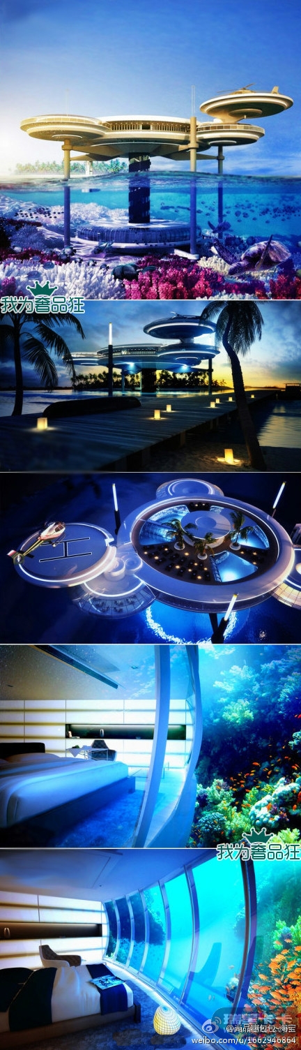 以奢华举世闻名的迪拜啊!海底酒店位于迪拜阿拉伯湾水下60英尺,自称为十星级酒店! 分海上和海底两部分,共拥有21个房间,还有潜水中心和酒吧供娱乐休闲。水上部分则是有餐厅、温泉浴场和巨大的游泳池。