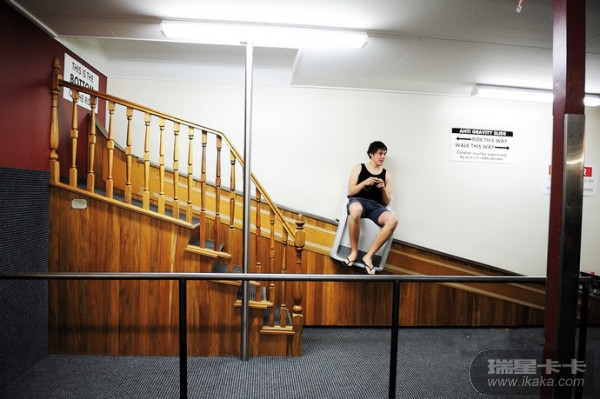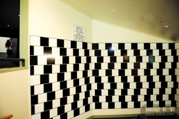 下面进入的一个屋子就更有趣了,从走进屋子的那一刻起,你的视觉就被屋子里面的布置所欺骗,对于水平完全失去了概念。人在这里是倾斜着站立的,水在这里是从下往上流的。看看站在台子上的两个女孩,后面那个倾斜的其实是站直的,前面这个站直的其实是往后仰靠在墙壁上的。每个人进了屋子以后,由于视觉收到屋内布置的影响,失去了平衡感,走路都和喝醉了酒似的,很有趣。