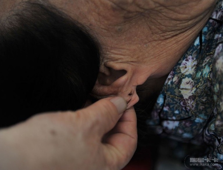 图为2012年7月1日,侵华日军当年曾撕裂万爱花带着耳钉的耳垂。
