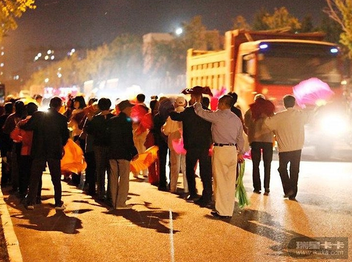 2013年09月11日,吉林省长春市,居民自发组成的秧歌队正在道路一侧扭秧歌,一辆货车从秧歌队旁驶过。对于交通安全,老人们都不太在意,他们说上百人在路上跳,目标很大,开车的人能躲着他们,不可能撞到他们的。