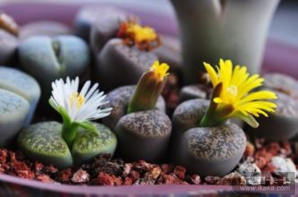 生石花品种较多,各具特色。从对生叶的中间缝隙中开出黄、xxx等色花朵,生石花形如彩石,色彩丰富,娇小玲珑,享有“有生命的石头”的美称。