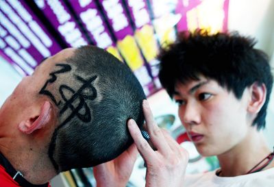 郑州球迷模仿阿泰斯特的火箭队徽发型