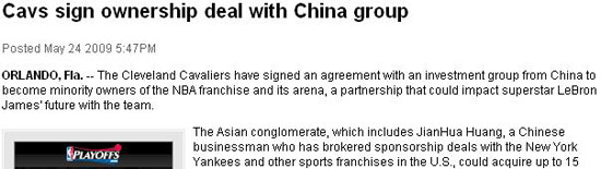 新浪体育讯 北京时间5月25日消息 据美联社报道,NBA克利夫兰骑士队已经与一个来自中国的投资集团签下协议,该集团成为骑士队和速贷中心球馆的所有人之一。