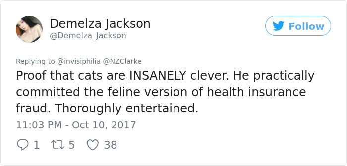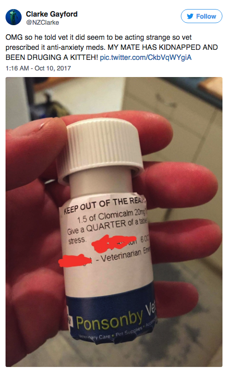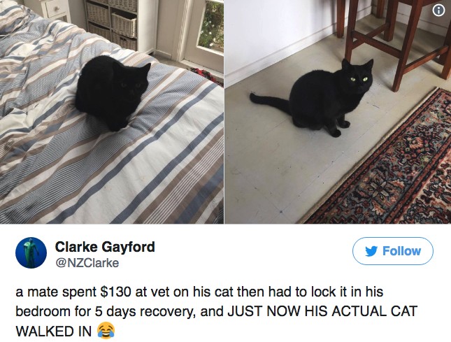 网友@Clarke Gayford 分享了他兄弟的一段神奇经历:哥们儿觉得自己家的猫行为有点怪怪的,疑似抑郁,于是送去看兽医。