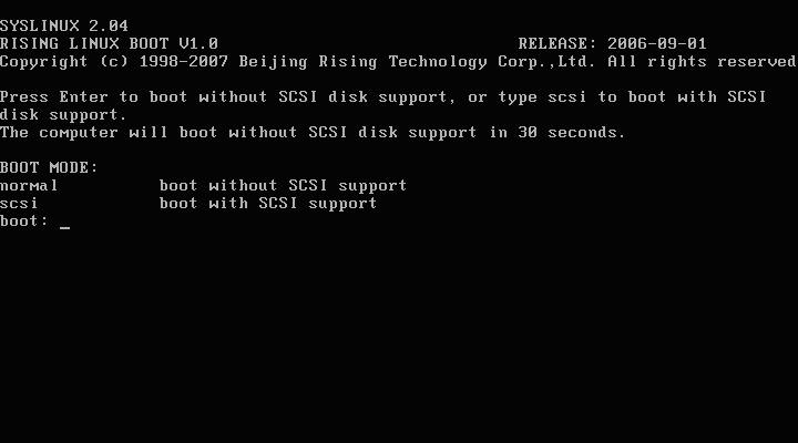 1.在”boot:”后输入”normal”然后按回车键(如图 5);或者直接按回车键,进入不支持 SCSI 的启动方式;