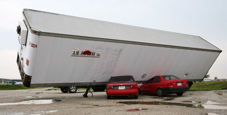 2007年6月18日,美国威斯康星州,一节卡车拖车被被风吹倒压在两辆小车上。