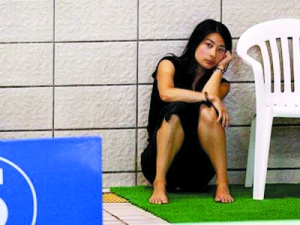 因为要走过场才参赛的郭晶晶无聊地坐在赛场边,