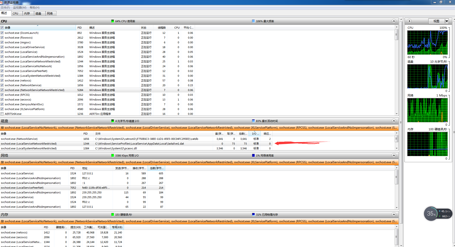 感谢12楼与13楼的建议,通过设计该文件夹的权限及设计防护规则,拒绝病毒访问c:\programdata\appdata ,总感觉治标不治本,果然重启电脑就有触发记录,查看触发日志,还是SVCHOST.EXE访问,看任务管理器,也无法分辨出到底是哪一个进程在搞的鬼