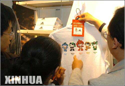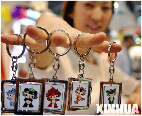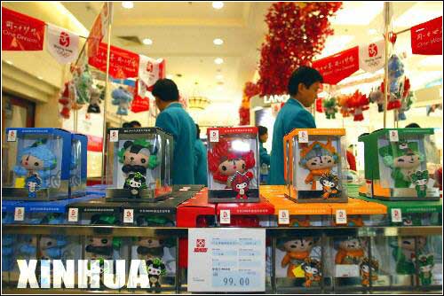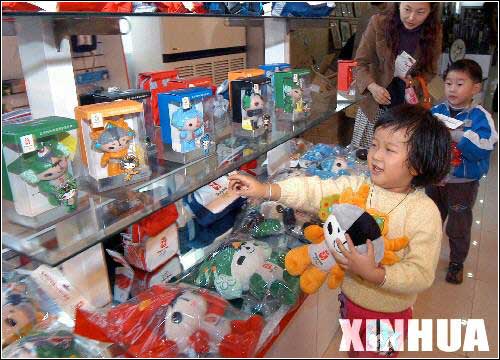 两个孩子在家长的陪同下选购奥运会吉祥物“福娃”。当日上午,北京奥运会吉祥物“福娃”在扬州开始销售,吸引了众多市民带孩子前来购买。