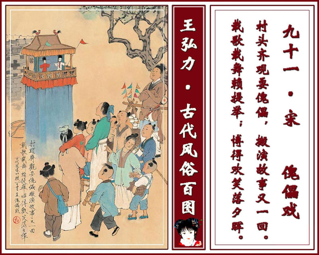九十一 宋 傀儡戏 村头齐观耍傀儡,搬演故事又一回。载歌载舞赖提举;博得欢笑落夕晖。