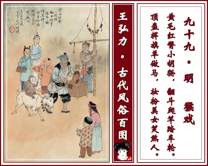 九十九 明 猴戏 黄毛红臀小胡狲,翻斗爬竿踏车轮。顶盔挥旗羊做马,妆扮美女笑煞人。