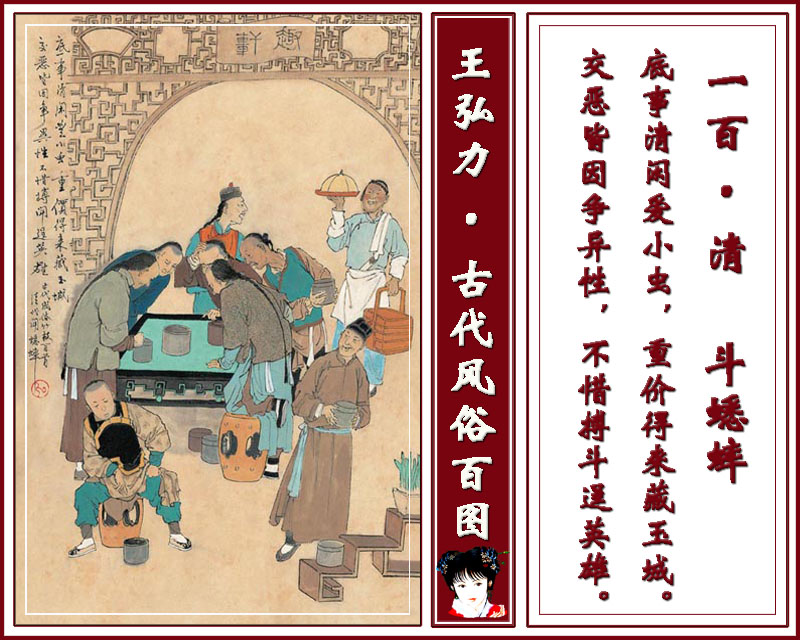 一百 清 斗蟋蟀 底事清闲爱小虫,重价得来藏玉城。交恶皆因争异性,不惜搏斗逞英雄。