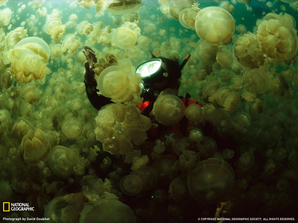 在帕劳群岛的其中一个海洋湖泊里,湖水因水母而翻腾着。在这个太平洋的群岛里,大约有80个像这样的湖泊,每一处都隐藏着惊奇。
