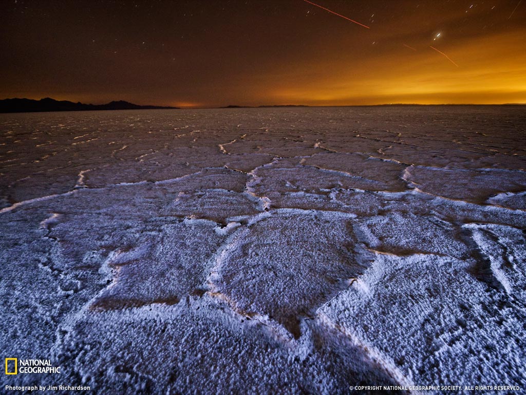 超过100英里(160公里)之外的盐湖城的灯光映红了犹他州博纳维尔盐滩的地平线上空。