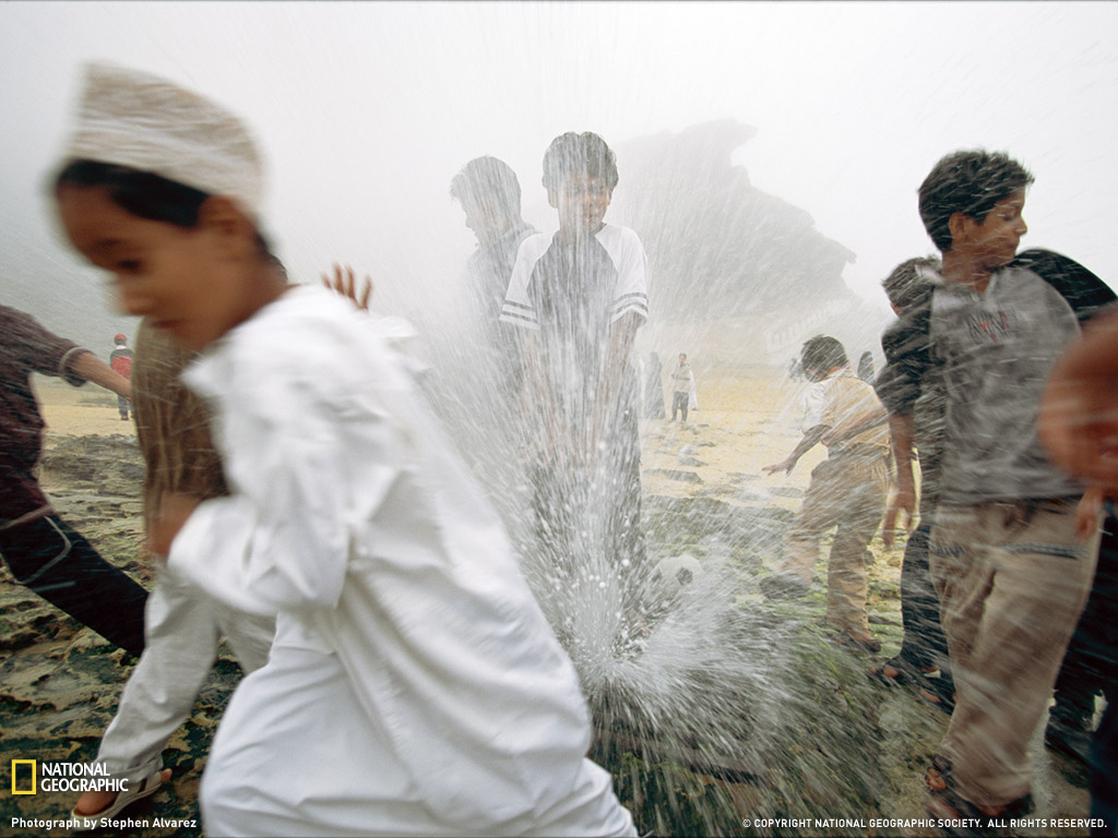 在阿曼的海岸线上,孩子们著迷于从一个天然形成的海水喷井中喷出的盐水水沫。