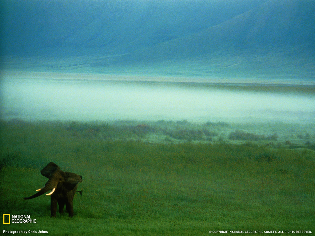 一只非洲象穿越坦桑尼亚恩戈罗戈罗火山口葱翠的草地。