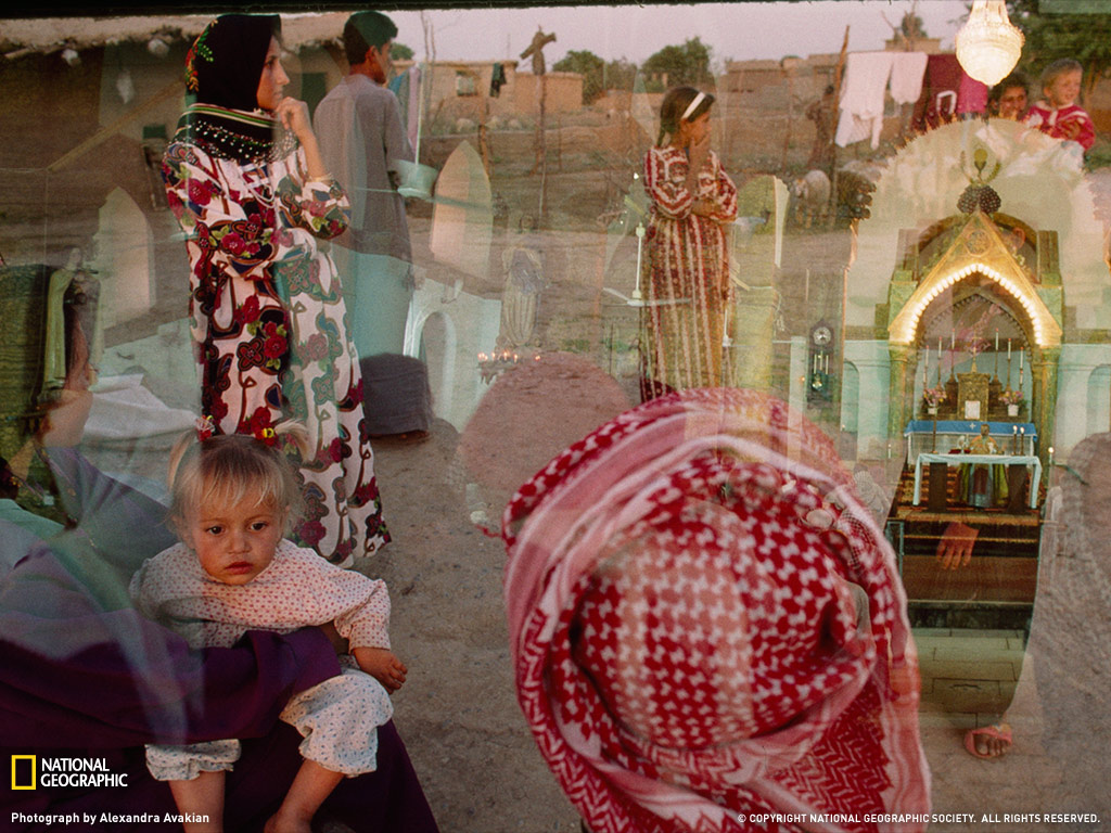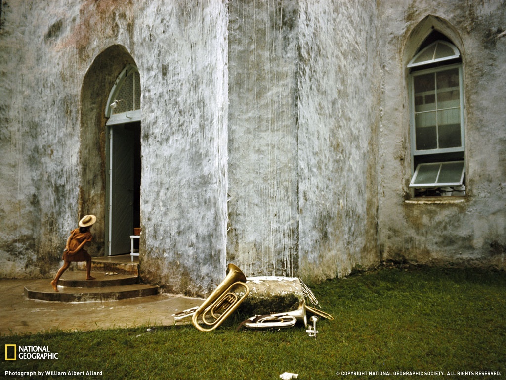 在新西兰的库克群岛,一名小女孩在前往教堂礼拜时迟到,不安地从门外向内窥探。