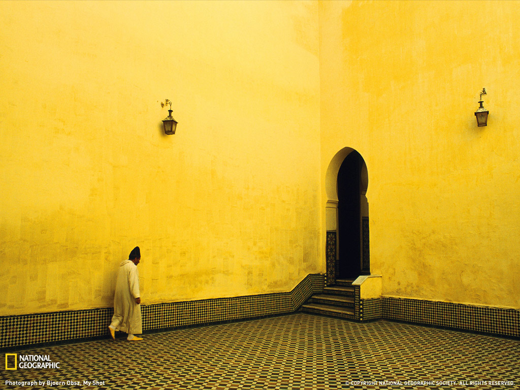 图为摩洛哥北部古城梅克内斯穆莱伊斯梅尔神殿一所美丽的黄色房间。