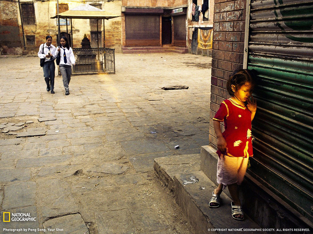 照片中的是尼泊尔加德满都一个卷帘门外的小女孩。
