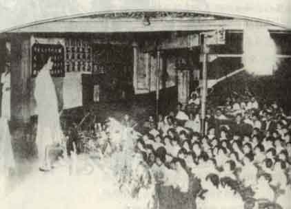 1931年上海中等学校于6月27日在更新舞台举行之第二届联合毕业典礼,正在台上演讲者为王孝英。更新舞台,初名三星大舞台,1934年因经营不力而易手,改名更新舞台。是当时上海四大舞台之一,专演京剧。1942年再次易手,改名中国大戏院。