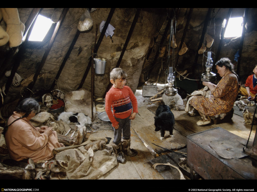 西诺特塔家的“chum”(涅涅茨人的一种圆锥形帐篷),或说是帐篷,作为七个人和十一条狗的家,在零度以下的天气里仍保持着温暖,这归功于一个在它上面装有烟孔的铁炉。在这个"chum"内的空间和社交生活受到严格的管制,同时缝纫材料会被存放在一个为女人保留的专门区域里。
