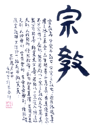 宗教者,分宗而教也,分宗之教也。通往终极真理之路千万条,众生根基千万类,有类便有宗,不分宗难以应机,然而若欲以一宗之教化天下万类,发心可能善,结果未必善。若能以一宗深入,捂透天机,人我能所,倏然粉碎, 则可彻见真理,发现万类无别,人神无别,空有无别,在世出世无别, 便能破除宗教相,万法归一,拈花而微笑矣!