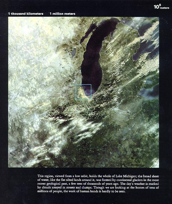 如果我记得不错的话,地理课上教过,这是北美五大湖区中的密歇根湖,框住的城市就是芝加哥。