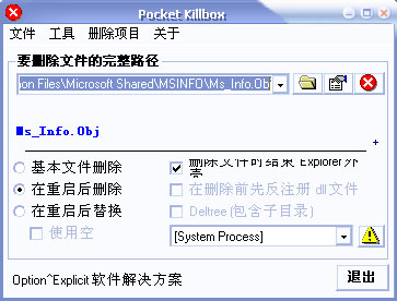 于是我们总结出经验..遇到这个,我们按 killbox 输入路径 C:\Program Files\Common Files\Microsoft Shared\MSINFO\Ms_Info.Obj  然后重启后删除….就搞定了…很轻松吧??