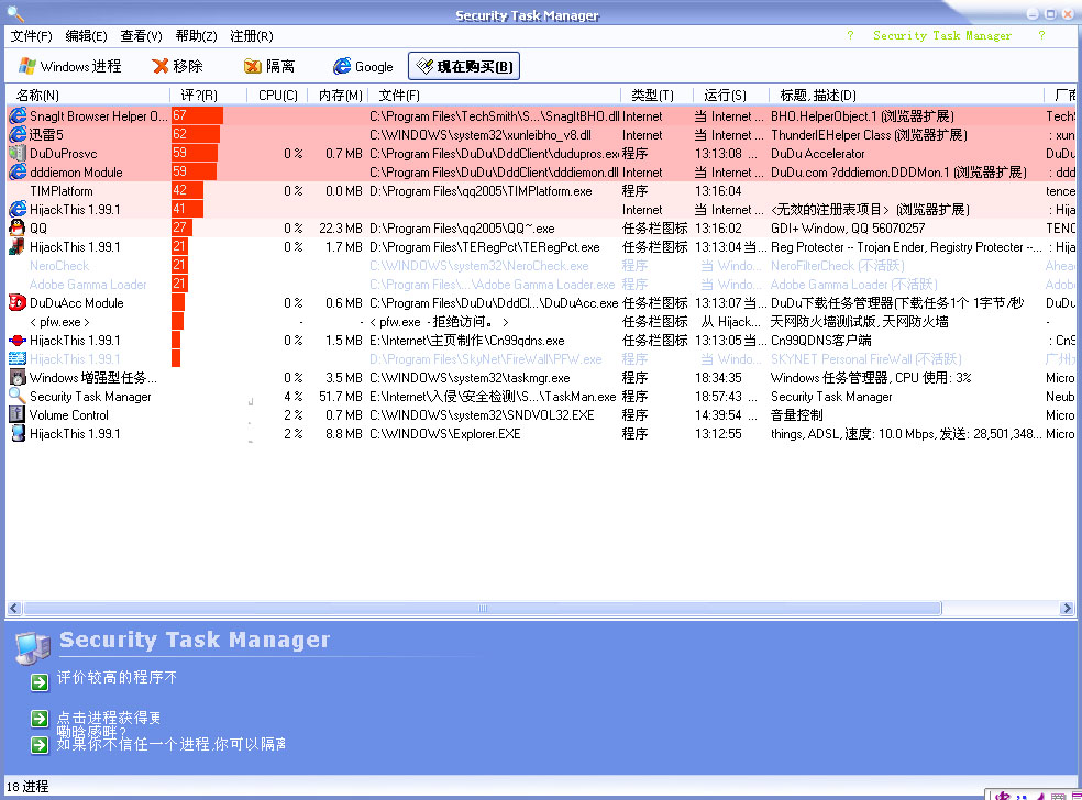 这个嘛..由于病毒走向更加隐秘的方向,一般的进程管理器已经准备可以扔到垃圾桶去了.