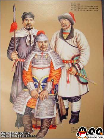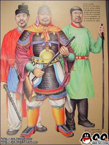 11、图为唐代穿明光甲及戎服的武士复原图。初唐的铠甲和戎服的基本保持着南北朝以来至隋代的样式和形制。贞观以后,进行了一系列服饰制度的改革,渐渐形成了具有唐代风格的军戎服饰。高宗、则天两朝,国力鼎盛,天下承平,上层集团奢侈之风日趋严重,戎服和铠甲的大部分脱离了使用的功能,演变成为美观豪华,以装饰为主的礼仪服饰。“安史之乱”后,重有恢复到金戈铁马时代的那种利于作战的实用状态,特别是铠甲,晚唐时已形成基本固定的形制,唐代的铠甲,据《唐六典》记载,有明光、光要、细鳞、山文、鸟锤、白布、皂娟、布背、步兵、皮甲、木甲、锁子、马甲等十三种。其中明光、光要、锁子、山文、鸟锤、细鳞甲是铁甲,后三种是以铠甲甲片的式样来命名的。皮甲、木甲、白布、皂娟、布背,则是以制造材料命名。在铠甲中,仍以明光甲使用最普遍