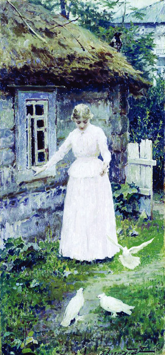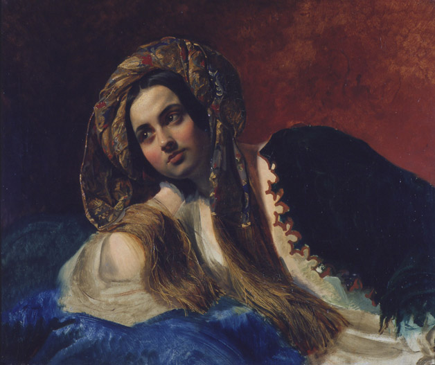 勃留洛夫(1799-1852)是俄国19世纪上半期学院派代表画家。他在彼得堡皇家美术学院师从于伊凡诺夫。1822年赴意大利学习,意大利古代艺术和文艺复兴时期大师们的光辉成就对他的创作产生了重大的影响。1827年他赴庞贝古城遗址考察后,于1833年完成了名作《庞贝的末日》,为他和俄国赢得了声誉。普希金评价这幅画堪称“俄罗斯画坛的初日”。 1836年他载誉回到了阔别十余年的彼得堡,并被皇家美术学院聘为教授。他的绘画体裁多种多样,兼风景、风俗、肖像、历史题材画家于一身。这幅以东方题材创作的《土耳其妇女》虽属风俗画,但仍可以看到学院派统领全幅的功力,画面用土耳其的服饰和布景展现了独特的东方风情和韵味。