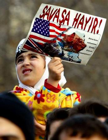 21、2003年3月20日,数千名澳大利亚人在首都悉尼示威游@行,抗议美国对伊拉克进行的军事攻击。图为悉尼一儿童额头写"NO WAR"标语。