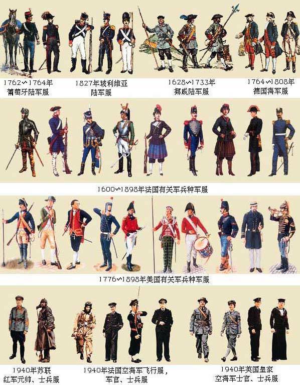 中国人民解放军87式常服有军官夏常服、冬常服,士兵夏常服、冬常服。①军官夏常服。陆军为棕绿色,海军为上白下藏青色,空军为上棕绿下藏青色。上衣为小翻领,两个上贴袋,两个下挖袋,西式裤;女军官上衣是两个下挖袋。用料为毛涤凡尔丁。配带色衬衣,系藏青色领带(女军官为玫瑰红色),金属制成的领花作为军种符号。制式衬衣,陆军为米黄色,海军为漂白色,空军为月白色,猎装式,开领,短袖,四个贴袋;女军官制式衬衣是两个下贴袋,夏季配藏青色仿毛西服裙。制式衬衣用料为精梳涤棉纱咔。大檐帽有军种牙线,帽墙外套人造丝带,陆军为正红色,海军为黑色,空军为天蓝色;帽饰带,将官为金黄色,校尉官为银灰色;帽徽为圆形,图案为“八一”军徽。②军官冬常服。颜色,陆军为棕绿色,海军为藏青色,空军是上棕绿下藏青色。上衣为立翻领,四个挖袋,西式裤;女军官是开领,两个下斜挖袋。用料为毛涤马裤呢,海军舰艇尉官为呢服。将官大衣,陆军、空军为棕绿色,海军为藏青色,两个挖袋,有后腰带,带活里防寒层,用料为马裤呢。校官大衣为风衣式,颜色与将官大衣相同,带活里防寒层,用料为涤棉咔叽。尉官、士官大衣,陆军、空军为草绿色,海军为藏蓝色,栽绒领,两个上斜挖袋,两个下贴袋,中腰有抽带和后腰带,絮片作防寒层(寒区为皮大衣),与校官大衣布料相同,舰艇尉官为呢大衣。冬帽是咖啡色栽绒帽或皮帽。③士兵夏常服。陆军、空军士兵夏常服,颜色与尉官冬常服相同。上衣为开领,四个贴袋;女士兵夏常服式样与女军官夏常服相同。用料为涤棉平布。士兵制式衬衣为开领,短袖,两个上贴袋,女士兵制式衬衣与女军官制式衬衣相同,用料、颜色与所在军种的军官制式衬衣相同。士兵大檐帽,式样与军官大檐帽相同,帽墙丝带陆军、空军为墨绿色,中间分别加1厘米正红色或天蓝色装饰线,海军为黑色;帽风带为黑色人造革。海军士兵夏常服为上漂白下藏蓝色,上衣是套头式带披肩水兵服,裤子为旁开口水兵裤,用料为涤棉平布。帽子为带飘带的无檐大顶帽。④士兵冬常服。式样与军官冬常服基本相同,上衣口袋改为四个贴袋。陆军、空军士兵冬常服颜色与夏常服相同,海军为藏蓝色。用料为涤棉咔叽。防寒层与尉官冬常服相同。海军舰艇士兵为套头式水兵服。大衣式样与尉官大衣基本相同,但有风帽、护膝,寒区为皮大衣,水兵为呢大衣。绒帽或皮帽有帽耳孔。军士长、专业军士、学员冬夏常服式样与尉官相同,用料与士兵冬夏常服相同;佩带军士长、专业军士、学员肩章。军礼服 是军人在重大节日、典礼、检阅和重要外事活动时着穿的制式服装。有的国家还有宴会服(晚礼服)、节假日礼服和常礼服等。多数国家军队只配发军官。军礼服用料讲究,多用纯毛或毛涤混纺织物,制作精细,色彩鲜艳,装饰注重民族风格。许多国家的军队还有仪仗队、军乐团礼宾服及演出服。中国人民解放军礼服有军官礼服,仪仗队和军乐团礼宾服,文工团演出服。军官礼服分夏礼服和冬礼服两种,均为西服式,采用方下摆。夏礼服为平驳头凡尔丁上衣和裤子,陆军为米黄色,海军是本白色,空军是浅天蓝色,领边、裤中缝有军种牙线。礼服领花将军为五星和松枝叶,校官为五星和麦穗,尉官则是五星和宝剑形光芒线组成。大檐帽饰有金黄帽檐花,着用常服的衬衣、领带和肩章。冬礼服为尖驳头礼服呢上衣和裤子,陆军为海蓝色,海军是藏青色,空军是宝蓝色,领边、裤中缝的牙线与夏礼服相同,配冬礼服大檐帽。配套服装与夏礼服相同