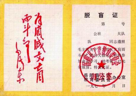 20世纪70年代,岳阳县工农教育委员会颁发的脱盲证