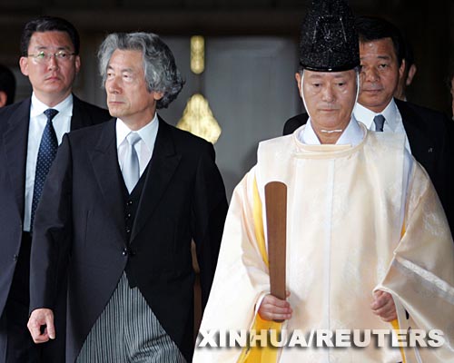 8月15日,日本首相小泉纯一郎(左二)在首都东京悍然再次参拜了供奉有二战甲级战犯的靖国神社