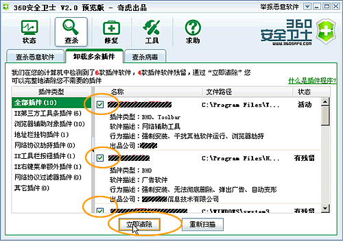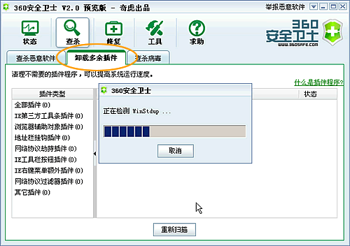 8、下面我们开始清理您电脑中的插件,点击“卸载多余插件”标签,程序会自动检测您电脑中的插件。