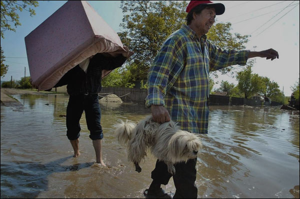 4月25日罗马尼亚斯潘托夫地区,多瑙河流域发洪水后人们正在紧急疏散。(国际在线独家资讯 付华一)