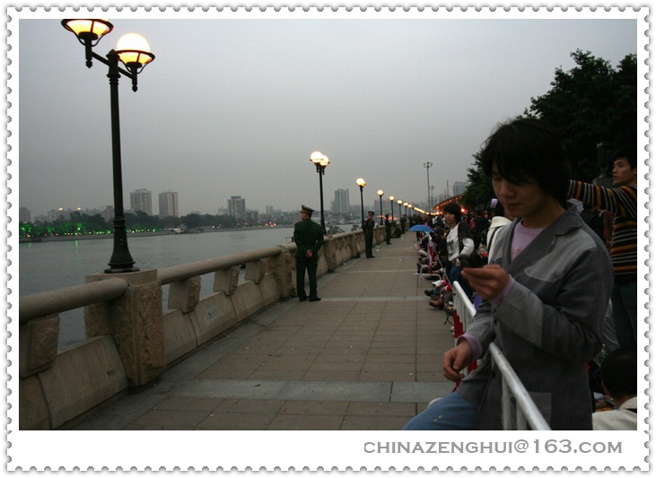 担心拥挤掉下珠江,开辟了一条隔离带,每十米左右,就有一位武警……