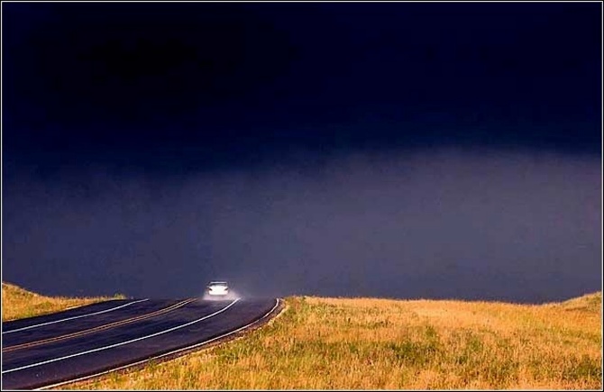 从背后打光:6月3日,美国Texas基林,在阳光的照耀下,一辆汽车行驶在201号高速公路上,轮胎在潮湿的路面上带起一片水花,远处正在乌云密布