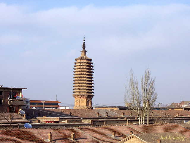 南安寺塔位于蔚县城南西侧。一说,始建于北魏佛都盛行时期,重修于辽;另据康熙四十五年《古南安寺修塔宝记》载,“蔚萝南安寺塔自汉始也,未有城已兹塔。”可见其年代久远。但据其结构造型分析,现存为一座辽塔。该塔为一座8面13级实心密檐砖塔,因坐落在南安寺,故名南安寺塔。后寺毁塔存,塔名仍沿旧称。塔高28米,塔基为石条叠砌而成,塔身置于莲花座之上。塔身第一层较高,各隅皆有塔柱,四周相间设拱形隔扇门与小窗,顶部雕盘龙,盘龙之上又有砖斗拱。二层以上变低。各层都悬有铁马,微风吹过,叮咚有声。塔顶雕饰莲花,承托刹身。此塔上下浑然一体,巍峨矗立, 宛如一幢造型精美、典雅庄重的阁楼。为国家级重点文物保护单位