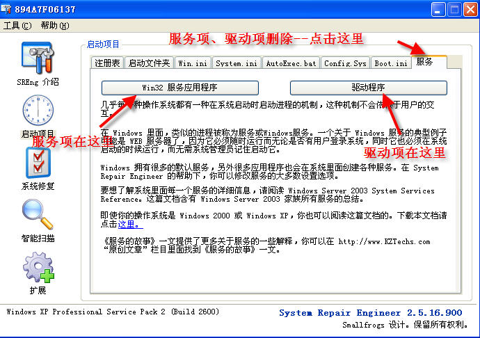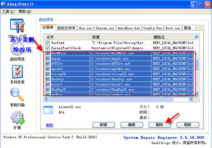 2、重启后,用SRENG删除下列注册表内容: