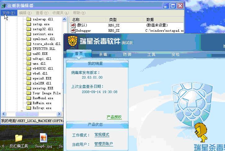 模拟病毒:关闭瑞星自我保护,结束瑞星监控进程,打开注册表编辑器建立对瑞星各个进程的映像劫持项。