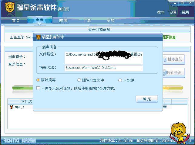 08的瑞星杀软中,通常碰到这样一种情况,解压缩后杀毒,此种情况应该是瑞星杀到了某个无法解压的安装包中存在病毒,但无法将其删除,应该在杀毒过程中做这样的判断。如果再出现解压缩后杀毒,应提供直接删除整个“安装包”的选择。
