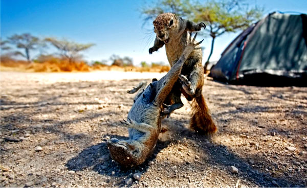 12月5日,纳米比亚埃托沙国家公园,两只灰松鼠因争夺食物而展开了一场搏斗。(图片来源:大卫—斯莱特)