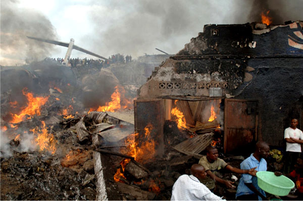 2月15日,刚果(金)一架飞机失事,冲入了一家市场,造成近50人死亡。图为人们争先恐后的去找水来灭火的情景。 (图片来源:法新社)