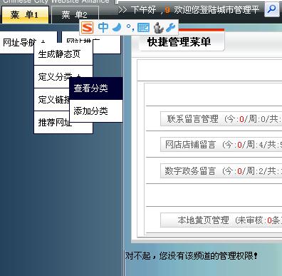 请注意,下面也是没有该频道的管理权限,但是上面的网址导航-定义分类-查看分类,却可以弹出3级菜单来