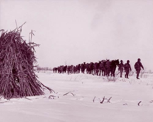在冰雪覆盖的田野上,国民党步兵在进行调防行军。(1948年1月,奉天)