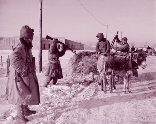 国民党兵用刺刀捅进骡车里,探查里面是否藏有“xxx”。(1948年1月,奉天)